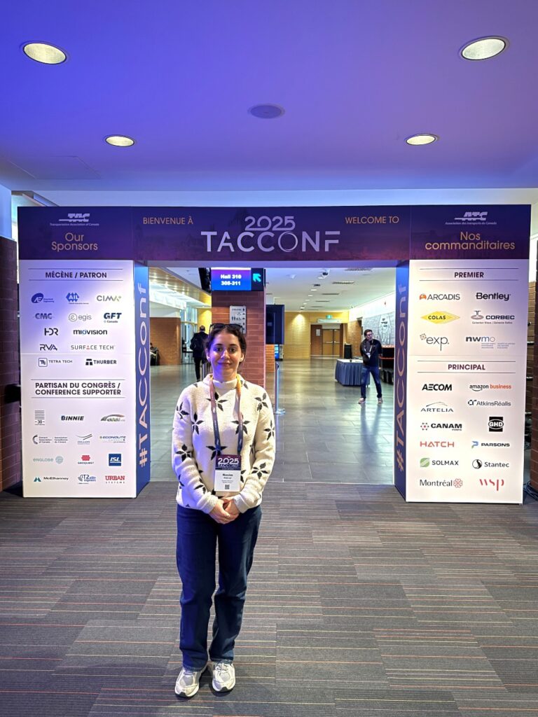 Nasim Deljouyi attended the Transportation Association of Canada (TAC) Conference and Exhibition 2025 in Quebec City, Canada (October 5–8), where she presented part of her research on AI-based methods for freight Origin–Destination (OD) estimation. Her presentation, titled “A Simulation-Based Methodology for Road Freight Network Extraction: Case Study in the Canadian Prairie Region,” showcased a multi-model traffic assignment approach for simplifying complex road networks while preserving key freight flow characteristics. Nasim received valuable feedback and questions on the real-world applicability of her proposed method and the data challenges involved in modeling freight movements. Beyond her presentation, Nasim enjoyed connecting with professionals and researchers across diverse areas of transportation. The conference provided an excellent opportunity for knowledge exchange and networking within Canada’s transportation community, and an inspiring setting in the historic city of Quebec.